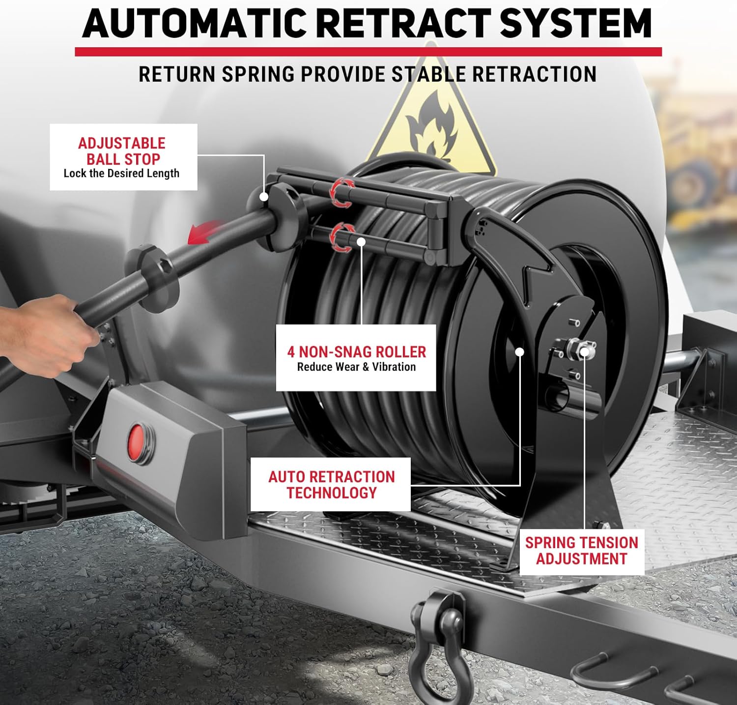 - Retraction Fuel Hose Reel: With the retractable spring system, you could save time rewinding your hose after use. When you pull the hose out, the valve body and disc rotate clockwise. After you're done filling up, just give the rubber hose a gentle tug, and it retracts counterclockwise by the spring until it stops at the adjustable hose positioner.