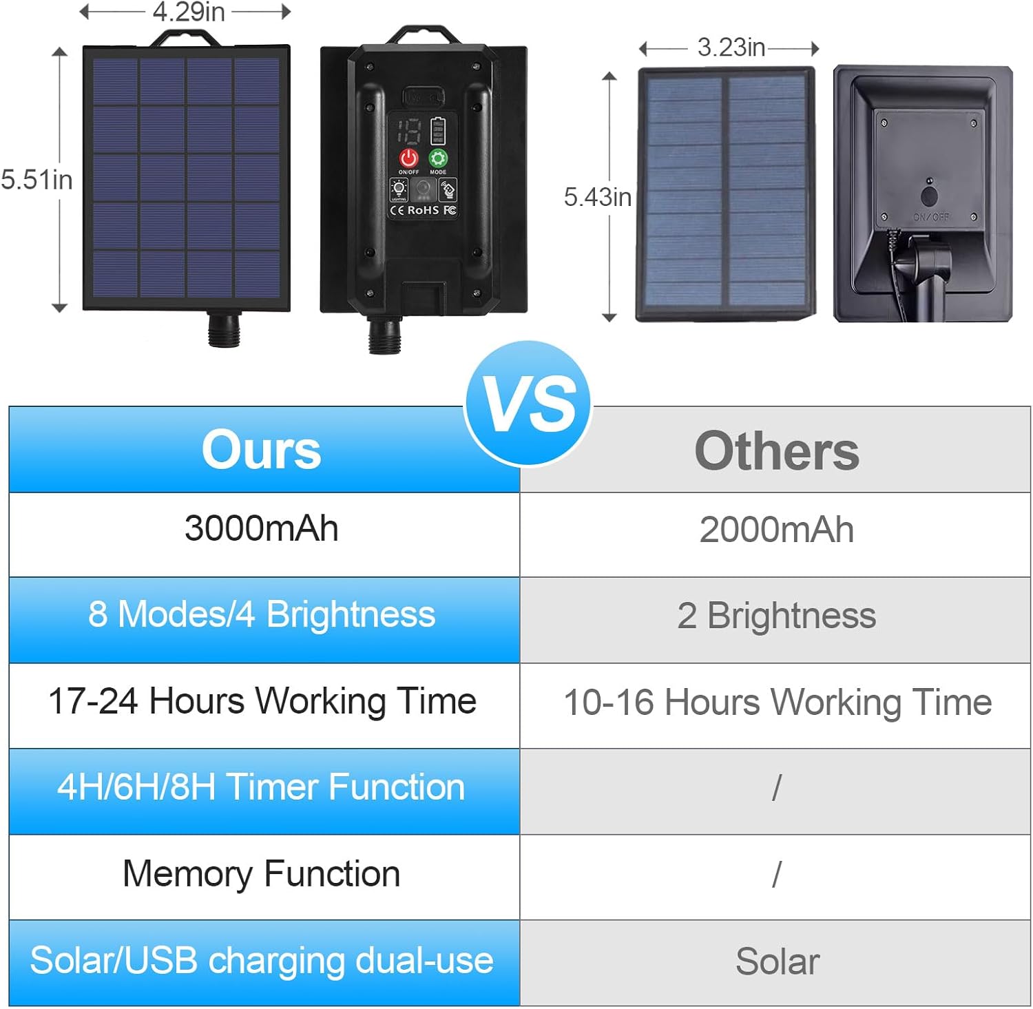 - 【Large Capacity Battery & Durability】- With a 3000mAh solar panel, the energy conversion efficiency is up to 30%; charging for 6-8 hours can work continuously for 17-24 hours. Thanks to the use of high-quality SMD 2835 lamp beads, the light is clearer and brighter, the light emitting is very uniform, and the irradiation range is farther and bigger.