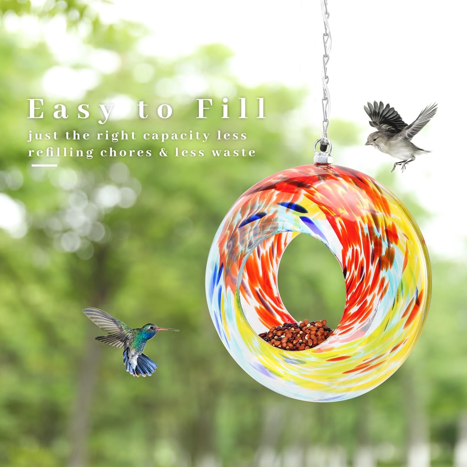 VCUTEKA Bird Feeder Solar Fly Through Bird Feeders for Outside Hanging with Round Shape Glass Container to Attract Wild Birds for Garden Decor, Solar Birdfeeder as Gift for Lovers, Red 8-Inch