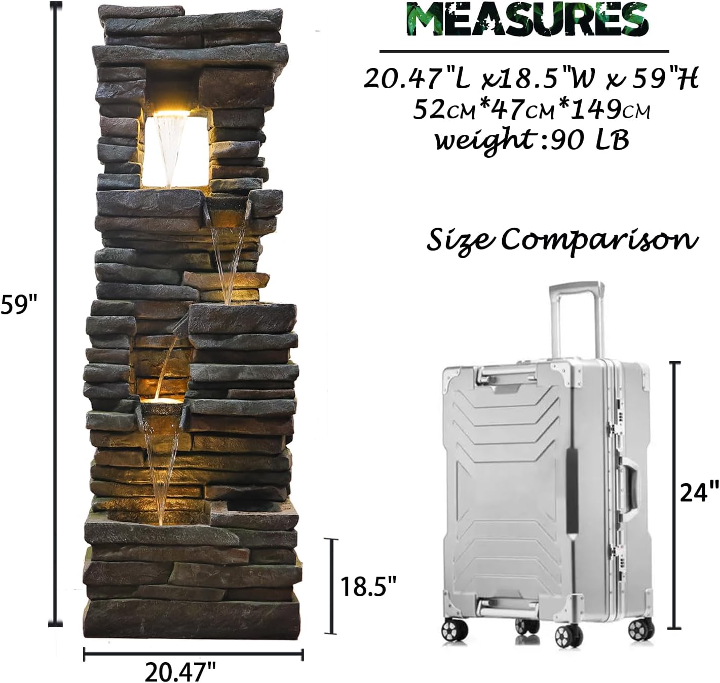 - Size and Accessories - The size of the patio fountain is 20.47"L x 18.5"W x 59"H. 9.8 ft Power Cord(Extended power cord solves your space problems).Accessories Include: Garden Fountain*1 Transformer*1,Pump*1, Pebbles*1,Detailed Instructions*1.