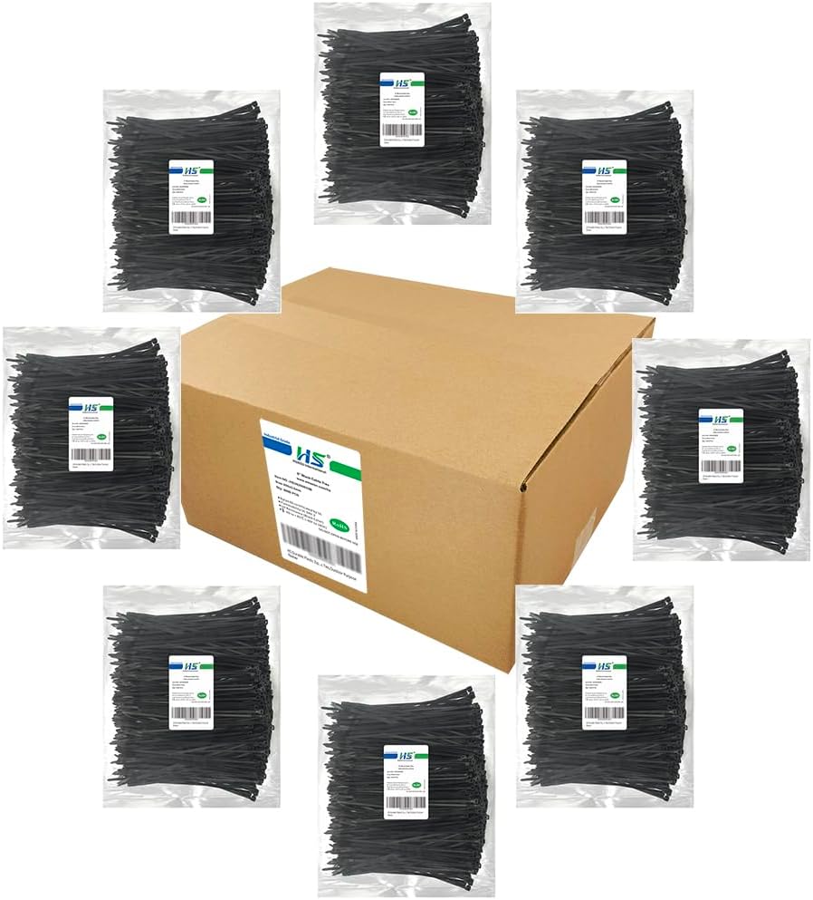 HS 8 Inch Zip Ties Black 40 Pounds Tensile Strength Thin Straps (Bulk 8000 Pack) Nylon PA66 UV Resistant,Self-Locking Small Electrical Plastic Cable Wire Zipties for Outdoor Use,Multi Purpose