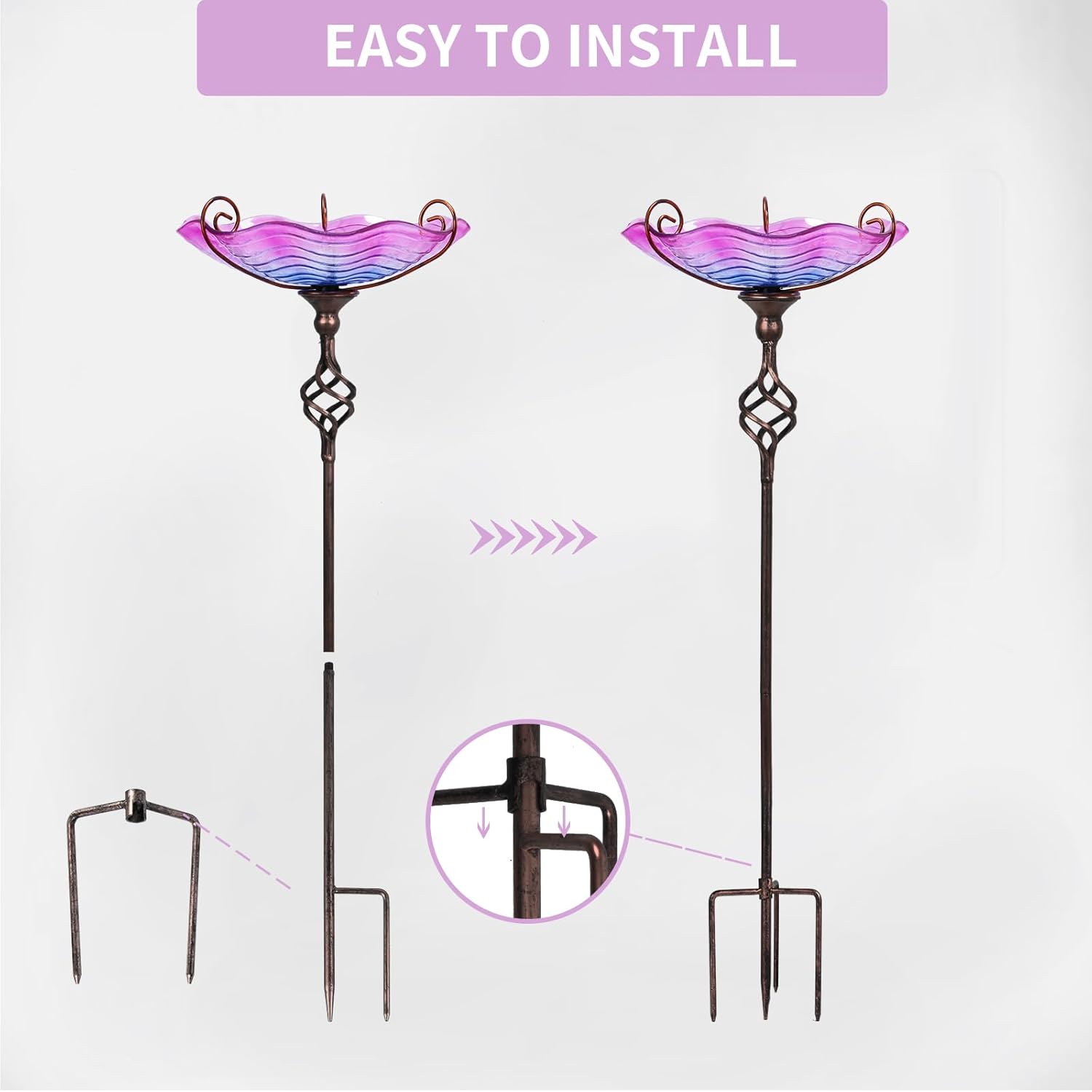 - Birdbath base with four-pronged bottom to add its more stability and make you move glass bird bath to place the perfect spot effortlessly, easy to assemble this purple birdbath