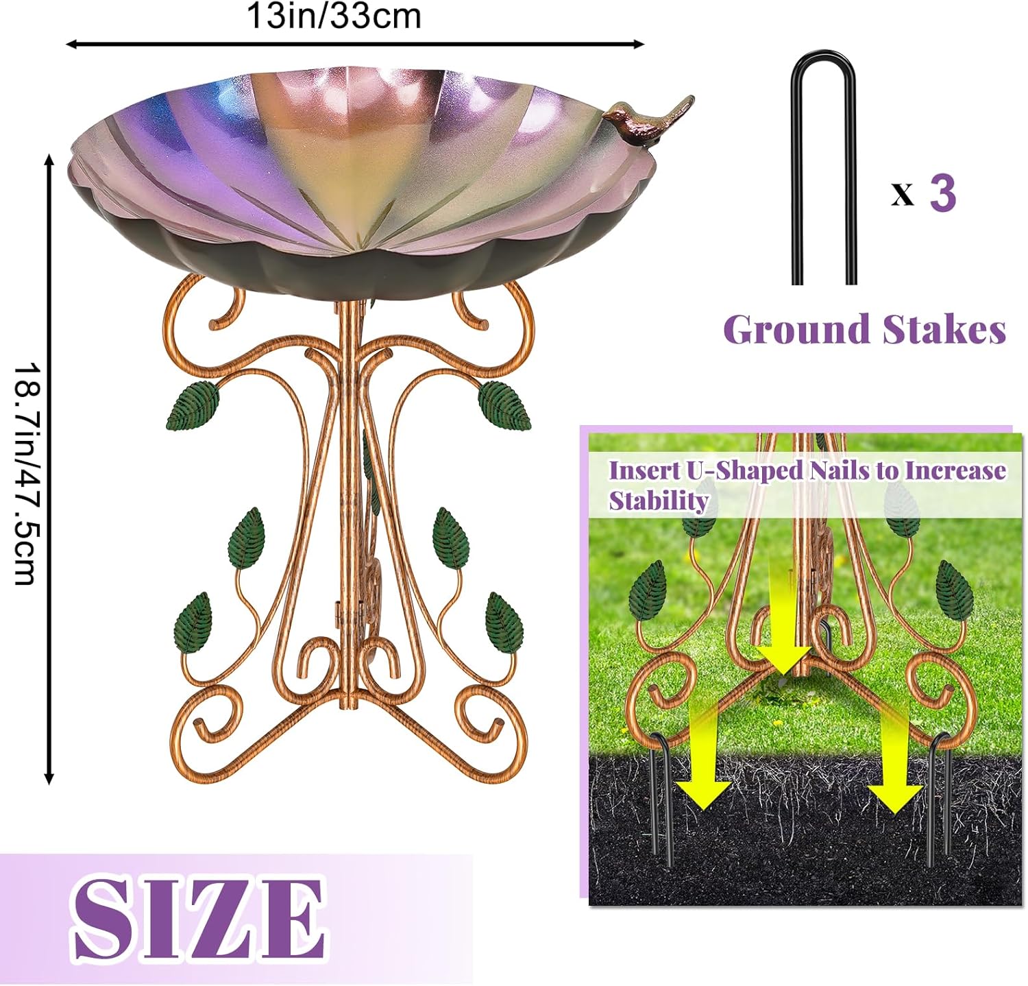 - 【A favorite for Bird Lovers】You can inserted birdbath into the ground or lawn of patios and gardens, attracting charming birds to your backyard to bath or share a feast. This cast iron bird bath can be a high class elegant decoration for your outdoor area or a special and decent holiday gifts for wild bird watchers and nature lovers.