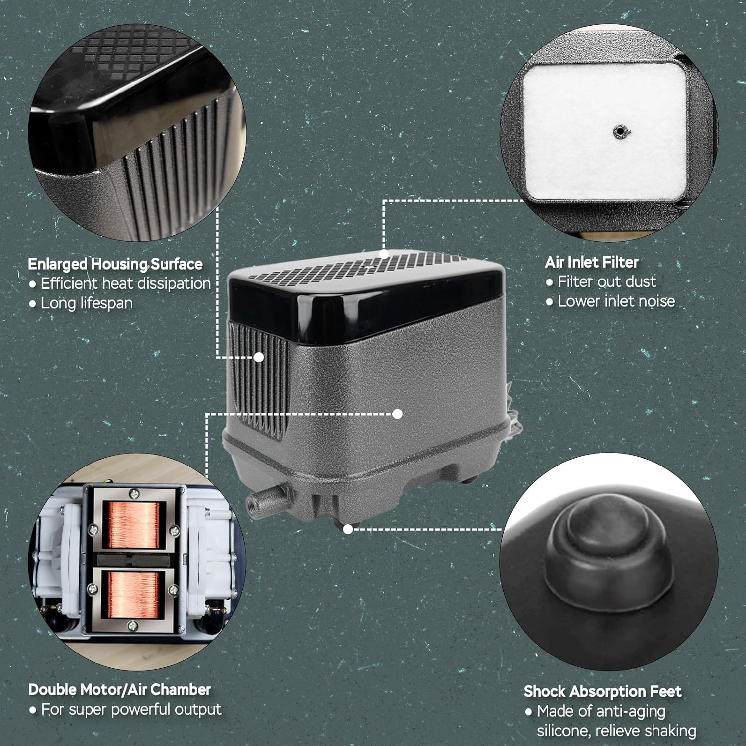 - IMPROVED HEAT DISSIPATION - The enlarged housing surface provides superior heat dissipation, keeping the pond air pump running stably. Perfect for continuous 24/7 operation in ponds, hydroponic air pump systems, or wastewater treatment.
