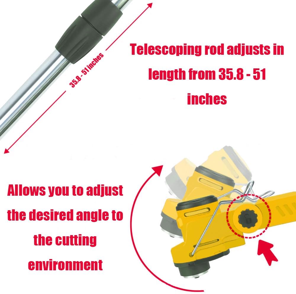 - đ¸ăAdjustable Telescopic DesignăďźElectric Cordless Weeder has an adjustable telescopic pole that can be freely adjusted between 36 and 52 inches, providing everyone with the length they need to work in a comfortable position, reducing stress on the back and shoulders also easy to transport and store. The angle of the cordless weed whacker head can be adjusted from 0 to 90 degrees, allowing you to mow even sloping lawns or hard-to-clean crevices